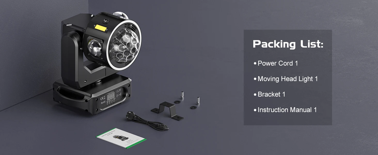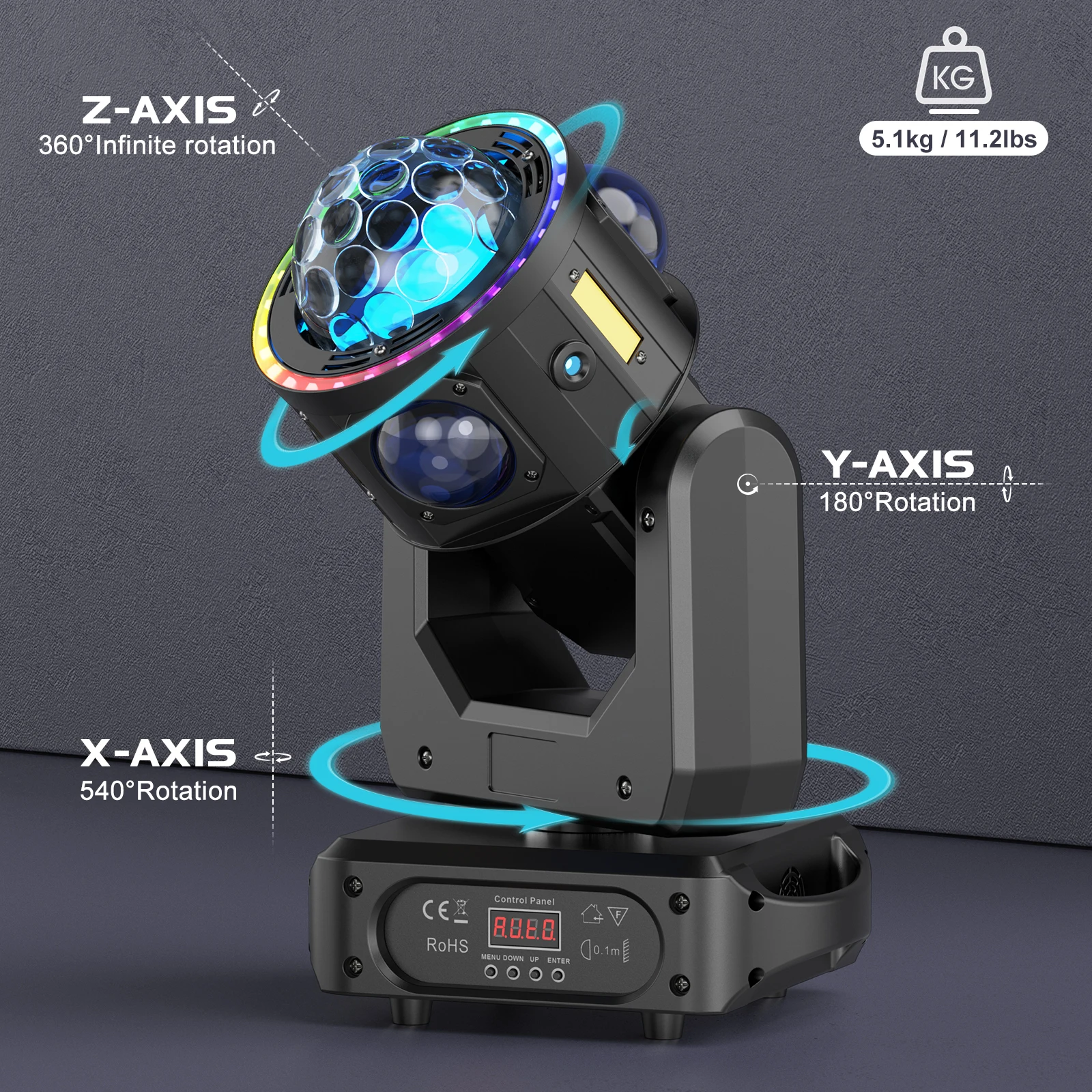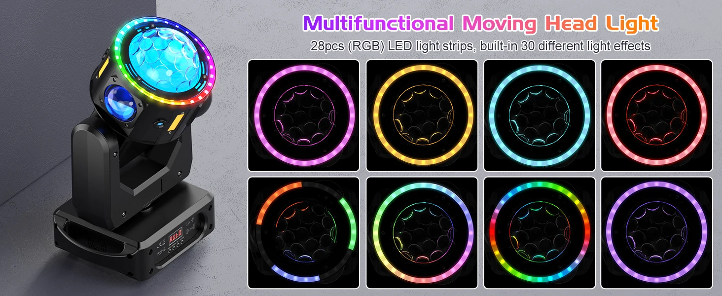 Product Description: The 120W LED moving head light has a special design with three axes that can move in different ways. It can turn completely around in all directions, so there are no dead angles.It also has a traditional U-shaped bracket that lets you use it vertically. It has a unique design and a variety of stunning lighting effects. You can experience the LED spherical effect, three beams of red, green, blue and white light with a narrow 2° output angle, as well as the charming red, green and blue star effect and golden flashing lights.In addition, the infinitely rotating head is also equipped with 28 RGB LED strips, providing 30 different running light effects, which can be controlled independently to meet the programming needs of various occasions. It is perfect for parties, bars, gyms, clubs and other places.