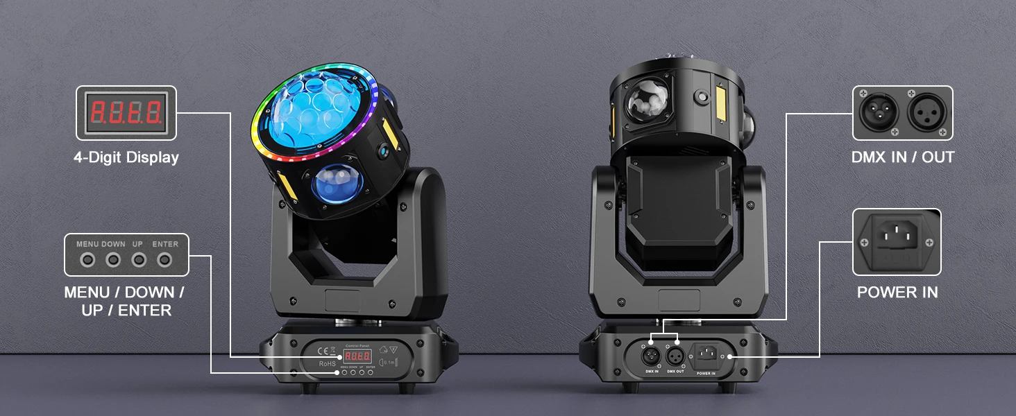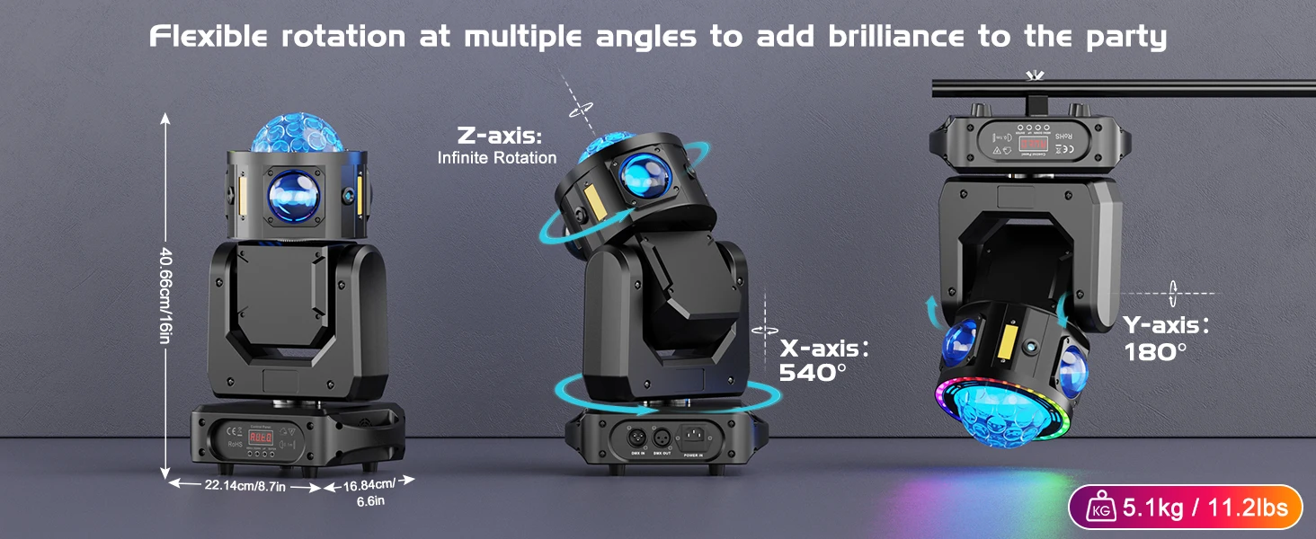 1. The 120W Moving Head Light features a sophisticated three-axis design, allowing for 540° horizontal rotation and 180° vertical rotation, ensuring comprehensive scanning capabilities without any blind spots thanks to its infinite rotation on the Z-axis.