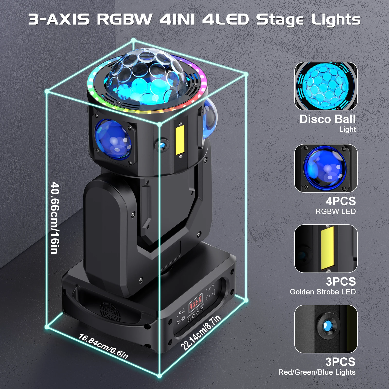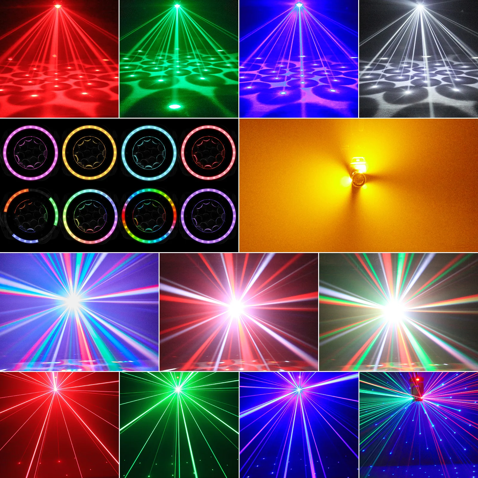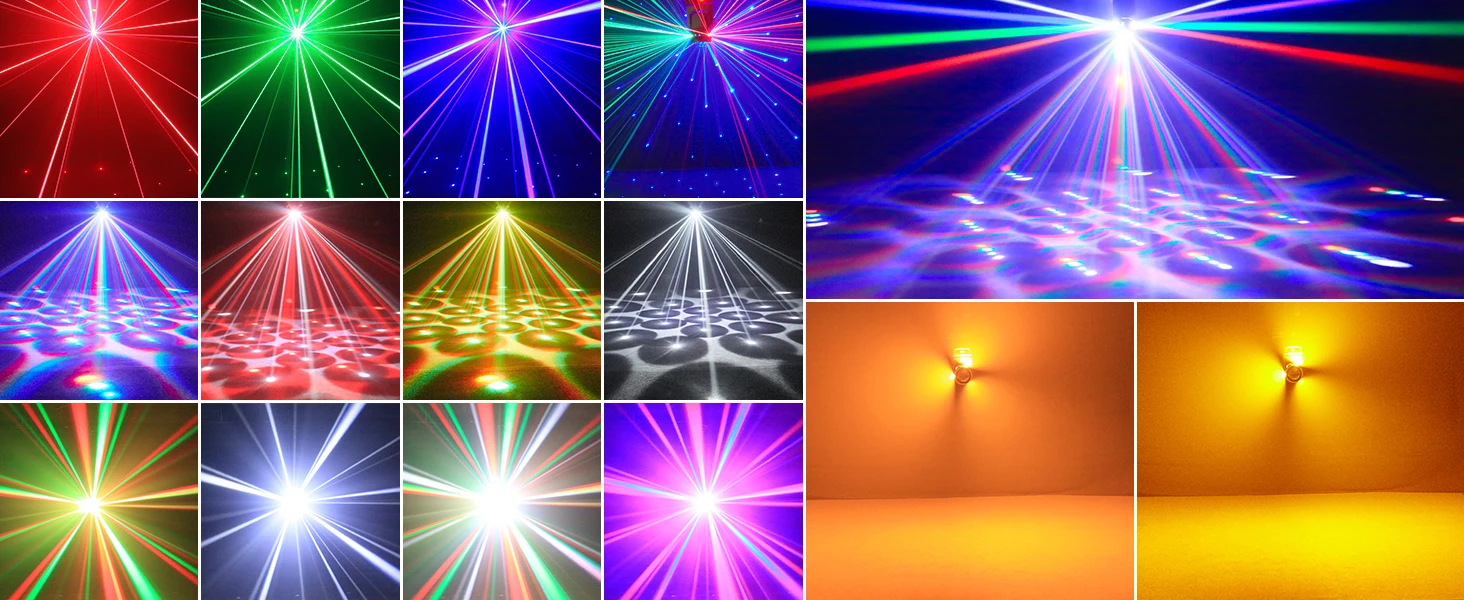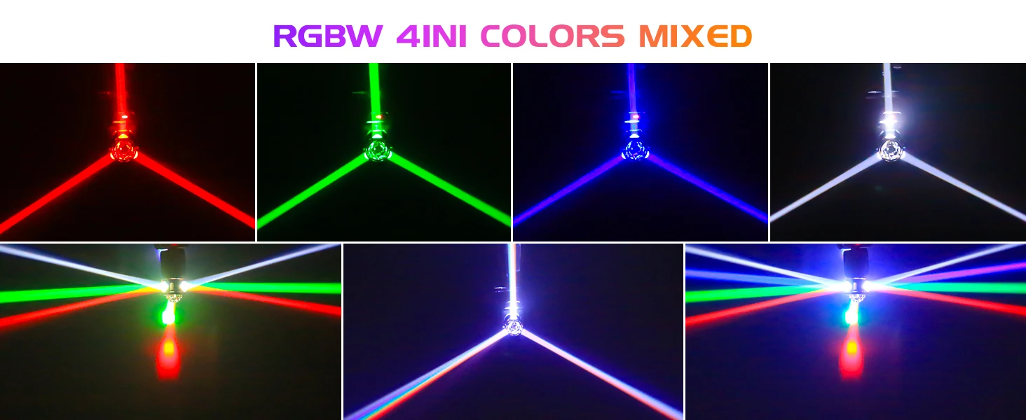 Light source:4 PCS 3W RGBW LED+28PCS 0.2W RGB LED+100mW Red Light+40mW Green Light+150mW Blue Light+3PCS 10W Golden LED Strobe