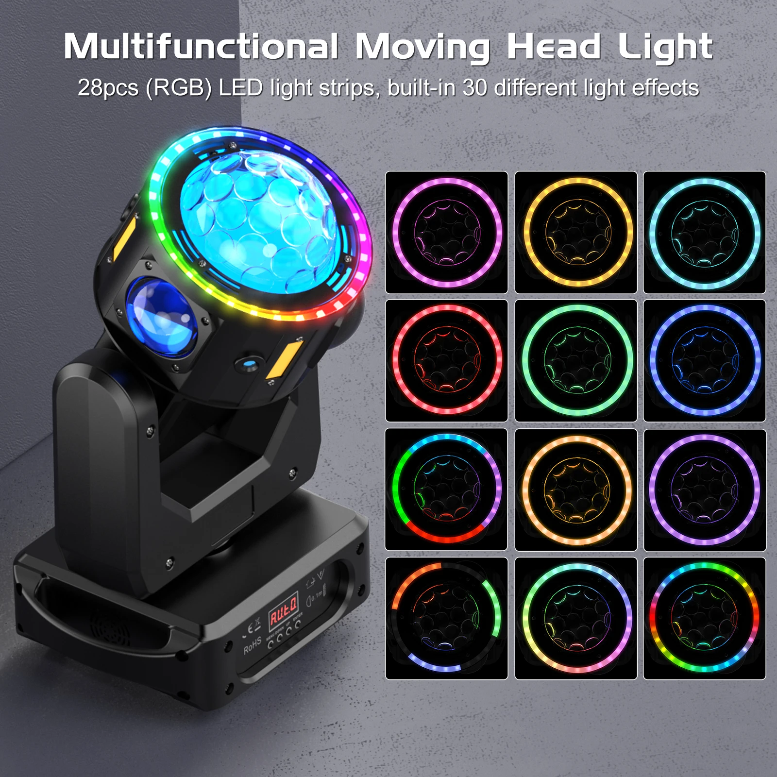 2. This versatile moving head light showcases various lighting effects, including vibrant RGBW LED beams with three different 2° angles (red, green, blue, white) and stunning starry effects in red and green. Additionally, it is equipped with 28 RGB LED strips that offer 30 distinct light chase effects, all of which can be independently controlled to accommodate diverse programming needs.