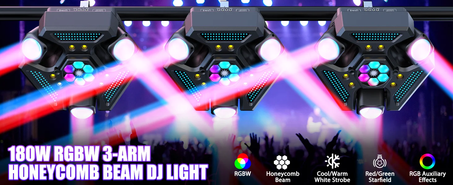 MIAX 180W RGBW 3-Arm Moving Head Light – Bee Eye Rotation & DMX512 Control