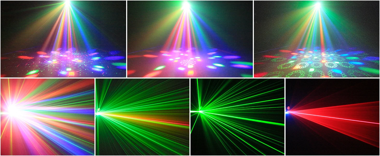 Light source:3PCS 3W RGB LED+2PCS 5W COB+ 1PCS 100MW Red Laser+1PCS 50MW Green Laser+5PCS 0.2W RGB Colorful LED
